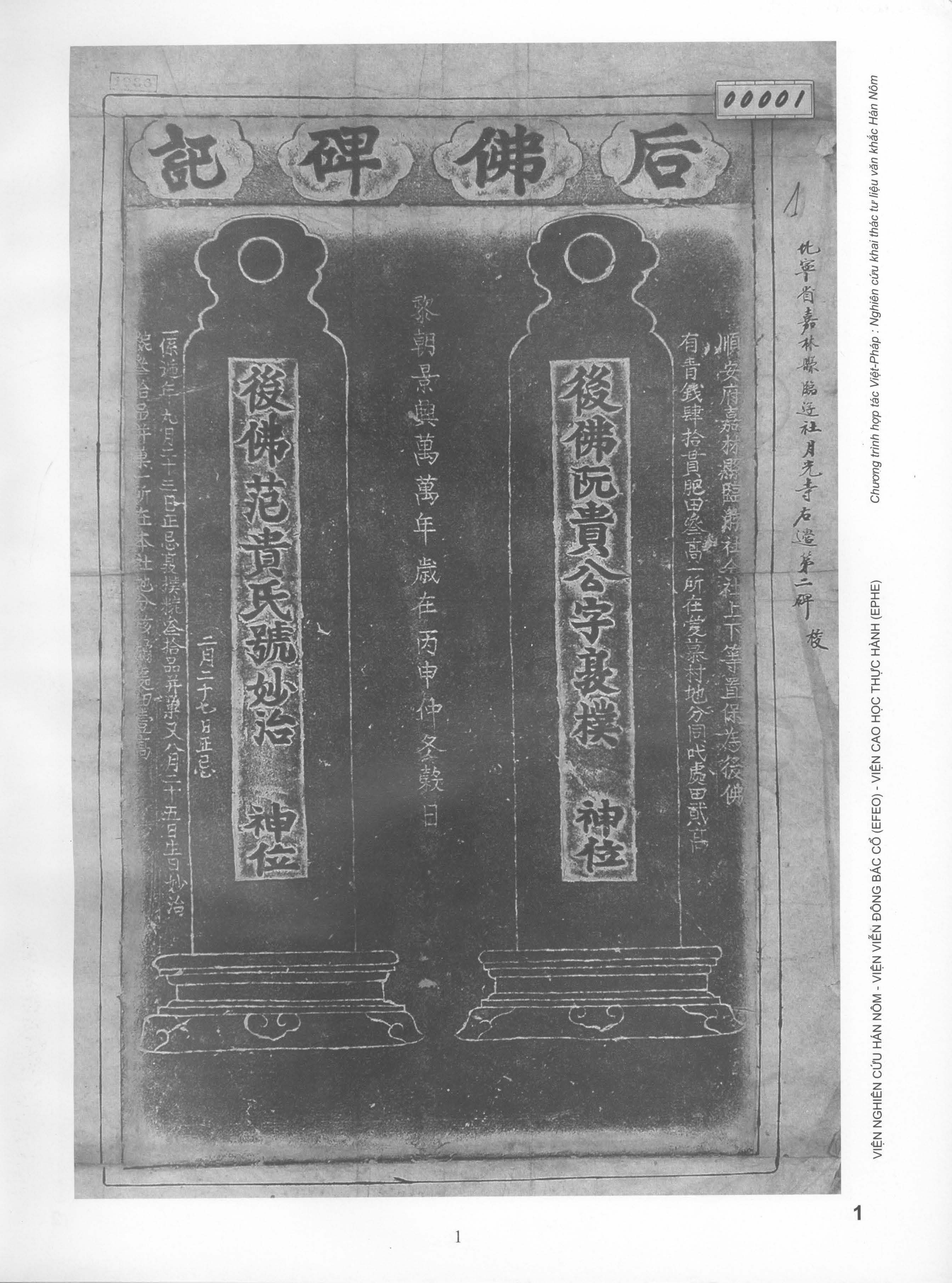 | 3 | Hậu Phật Bi Ký 3 后佛碑記 | xã Lâm Du huyện Gia Lâm phủ Thuận An 順安府嘉林縣臨游社 | chùa Nguyệt Quang xã Lâm Du huyện Gia Lâm tỉnh Bắc Ninh | Thác bản 1 mặt, khổ 35 X 62 cm, gồm 8 dòng chữ Hán, toàn văn ước khoảng 180 chữ, không có hoa vãn, không có chữ húy. |